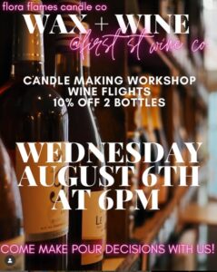 AUG 6TH AT 6PM FOR THIS FUN CANDLE MAKING COLLAB CLASS AND WINE TATSING FLIGHT EXPERINCE
